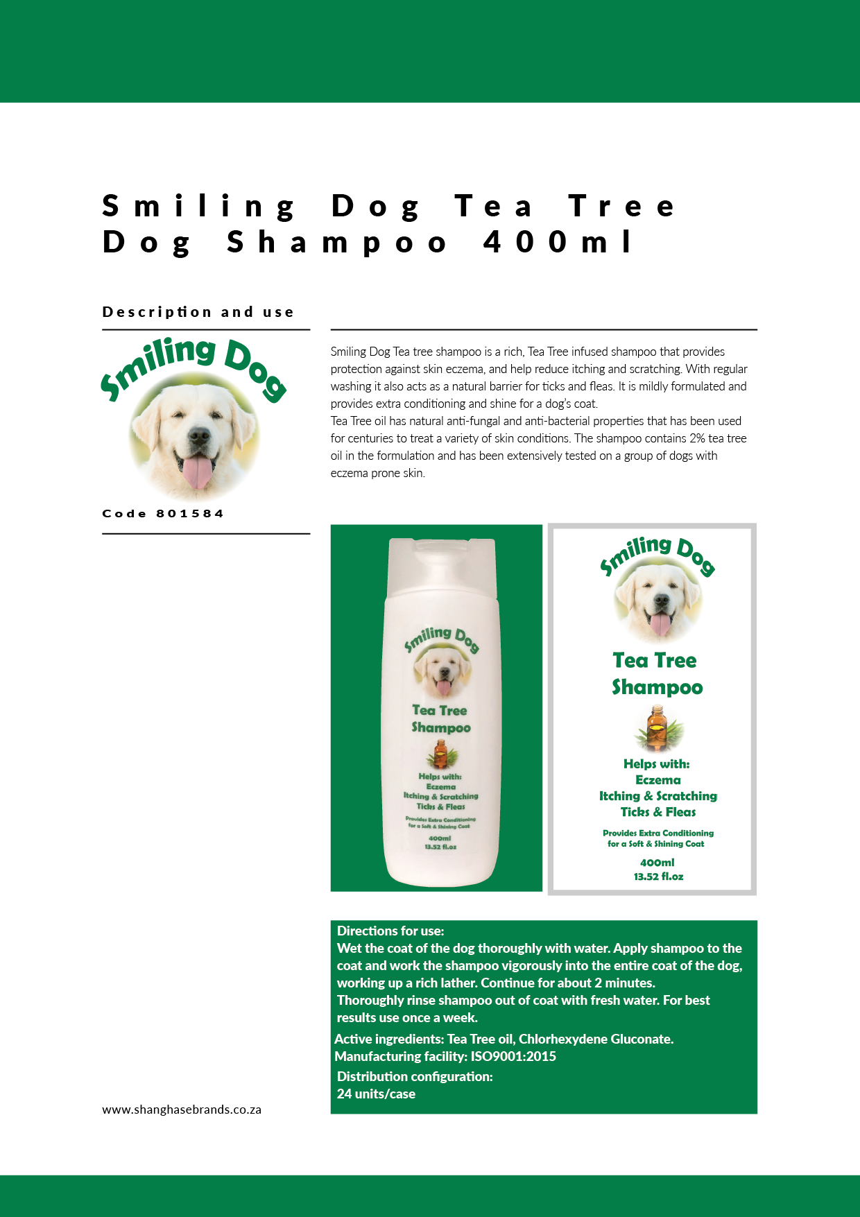 This fantastic dog shampoo has been specifically formulated to care for your dogs’ skin, utilizing the natural properties of South African Tea Tree Oil. The Tea Tree oil helps with eczema, reducing itching and scratching. It also helps control ticks and fleas. The shampoo is pH balanced for canine skin and leaves your dogs’ coat, soft, fluffy and shiny after wash. It is soft and gentle on human hands and lathers well for easy washing. It also contains no poisonous active ingredients! Don’t miss out on this great opening deal, buy now or at our online shop.