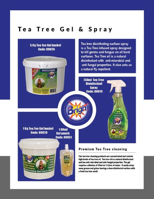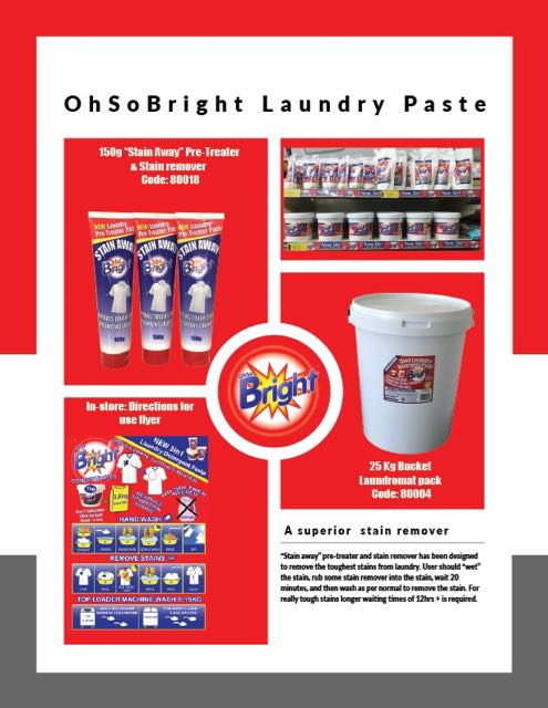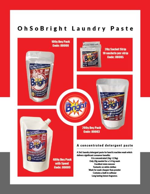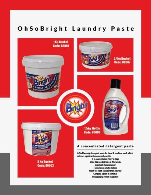 OhSoBright is a unique South African detergent and home-care cleaning brand. It is a premium product range and offers customers high active, concentrated formulas that easily takes care of daily cleaning tasks in and around the house or business. Our flagship products is a uniquely concentrated detergent paste that has a 3in1 formulation for removing stains, brightening and softening laundry without the use of fabric conditioner. Other products that compliment the range areĀ concentrated dishwashing liquid, , multipurpose cleaning sprays, tea tree gel floor cleaners, tea tree disinfection sprays, bleach, taxis shampoos, adn antibacterial liquid hand soaps.
